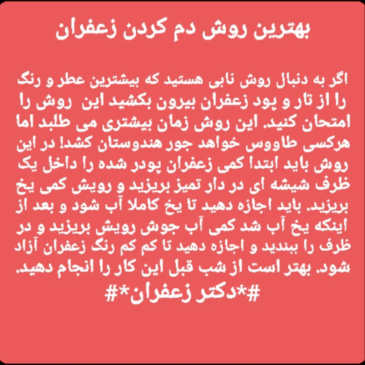 زعفران ما با بویی آسمانی و طعمی لذیذ، تجربهای منحصربهفرد را برای شما فراهم میکند. برای خرید زعفران با کیفیت برتر به ما سر بزنید." زعفران قائنات ترکیبی از نگین و شکسته زعفران اعلا (ومقداری ریشه زعفران رنگشده که با رنگ خود زعفران رنگ گرفته) با بهترین کیفیت وقیمت مناسب طعم واقعی زعفران را با ما تجربه کنید **ارسال از دفاتر پخش تهران و کرج**